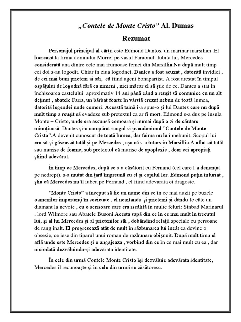 Dumas rezumat personajul principal al crii este edmond dantos un marinar marsilian el lucreaz la firma domnului morrel pe vasul faraonul. Puteti gasi foarte multe referate accesand categoriile din partea dreapta despre rezumat contele de montecristo uita te mai jos si o sa gasesti cele mai relevante rezultate pentru cautarea rezumat contele de montecristo. Iubita lui mercedes considerat una dintre cele mai frumoase femei din marsillia nu dup mult timp cei doi s au logodit. Apoi uiţi de ele.