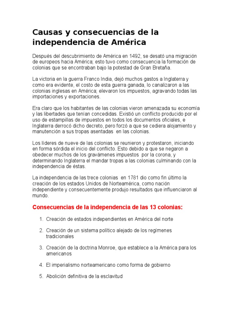 Cuáles Fueron Las Causas Y Consecuencias De La Independencia De Las 13 Colonias De Norteamérica