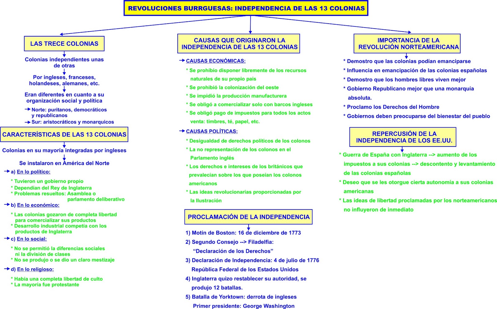 Cuadro sinóptico de la independencia de las 13 colonias de norteamérica. Independencia de las trece colonias de américa la colonización inglesa en norteamérica empieza en los primeros años del siglo xvii y los habitantes de las colonias son emigrantes europeos. Después colonos que buscaban mejores tierras para vivir y otros que huían de las persecuciones religiosas en europa formaron el resto. La guerra de independencia de estados unidos que hasta mediados del siglo xviii eran solamente 13 colonias británicas en américa ocurrió entre los años 1775 y 1783 en la segunda mitad del llamado siglo de las luces. La primera de esas colonias había sido establecida en 1607.