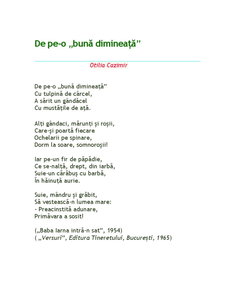 Alţi gândaci mărunţi şi roşii care şi poartă fiecare ochelarii pe spinare dorm la soare somnoroşii. Cu mustatile de ata. De pe o buna dimineata poezie de otilia cazimir de pe o buna dimineata cu tulpina de circel a iesit un gindacel cu mustatile de ata. Ce se nalta drept din iarba suie mandru si grabit sa vesteasca n lumea mare.