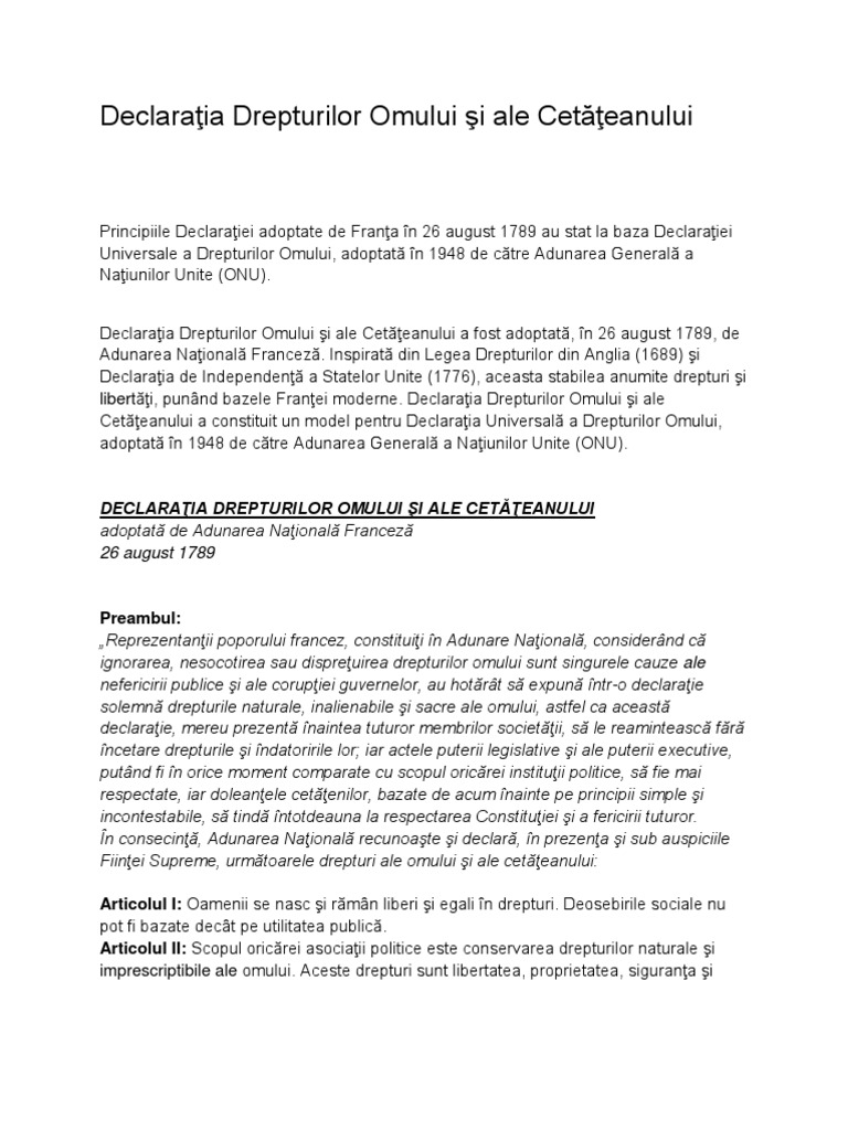 Declarația drepturilor omului și ale cetățeanului. Drepturile omului declaraţia drepturilor omului şi ale cetăţeanului a adunării naţionale franceze. Declarația cuprinde un preambul și 17 articole care combină dispozițiile privind drepturile a trei categorii de persoane. Declarația cuprinde un preambul și 17 articole care combină dispozițiile privind drepturile a trei categorii de persoane. Declarația drepturilor omului și ale cetățeanului în franceză déclaration des droits de l homme et du citoyen este carta fundamentală prin care la data de 26 august 1789 au fost puse în franța și în lume bazele democrației moderne.