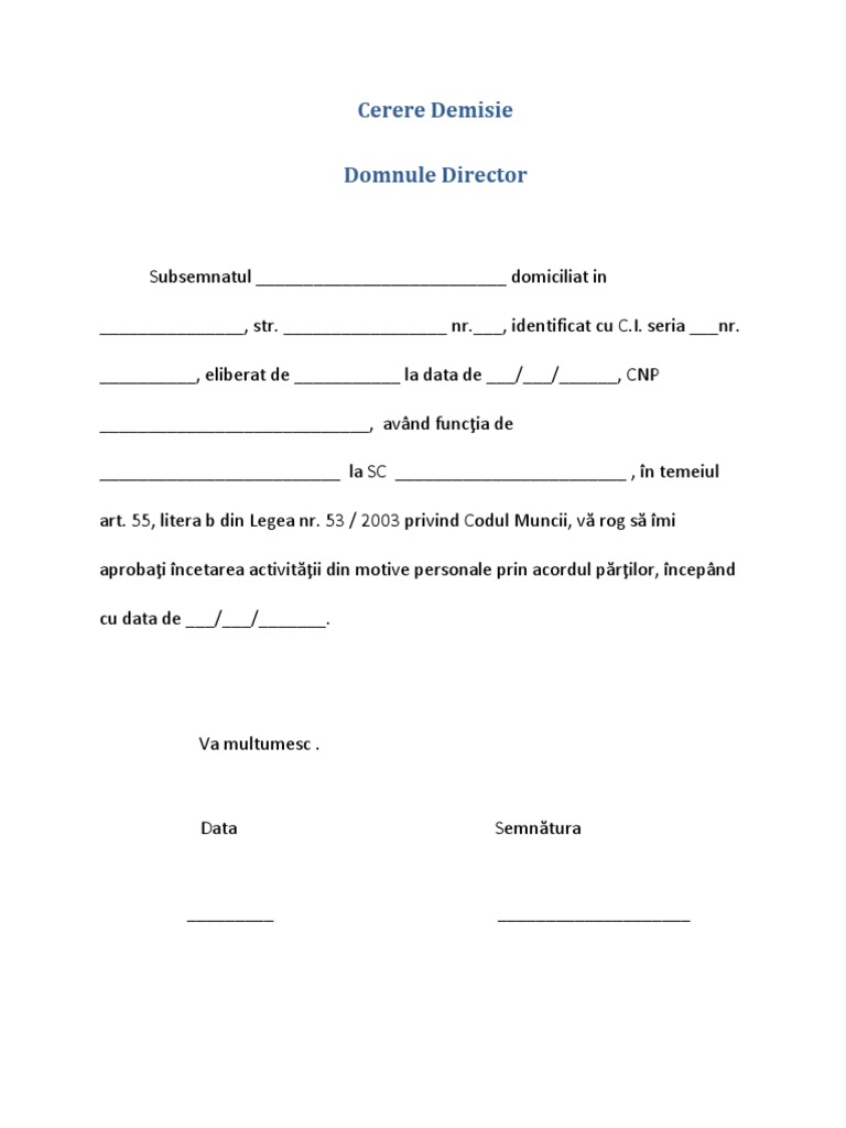 Acordul p ărţilor art. Doar abonații avocatnet ro premium au acces la. Demisie subsemnatul a salariat la în funcţia de vă rog să luaţi act de demisia mea urmând să încetez activitatea la data de. Salariatul va înainta angajatorului o cerere de încetare a contractului de muncă cu preaviz pe care angajatorul o va aproba.
