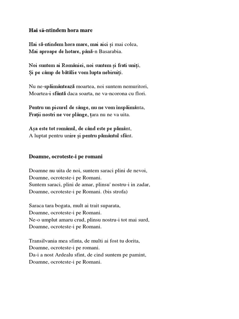 Doamne nu uita de noi. Săracă ţară bogată mult ai trăit supărată doamne ocroteşte i pe români. Ne o umplut amaru crud plânsu nostru i tot mai surd. Doamne nu uita de noi suntem saraci plini de nevoi doamne ocroteste i pe romani.